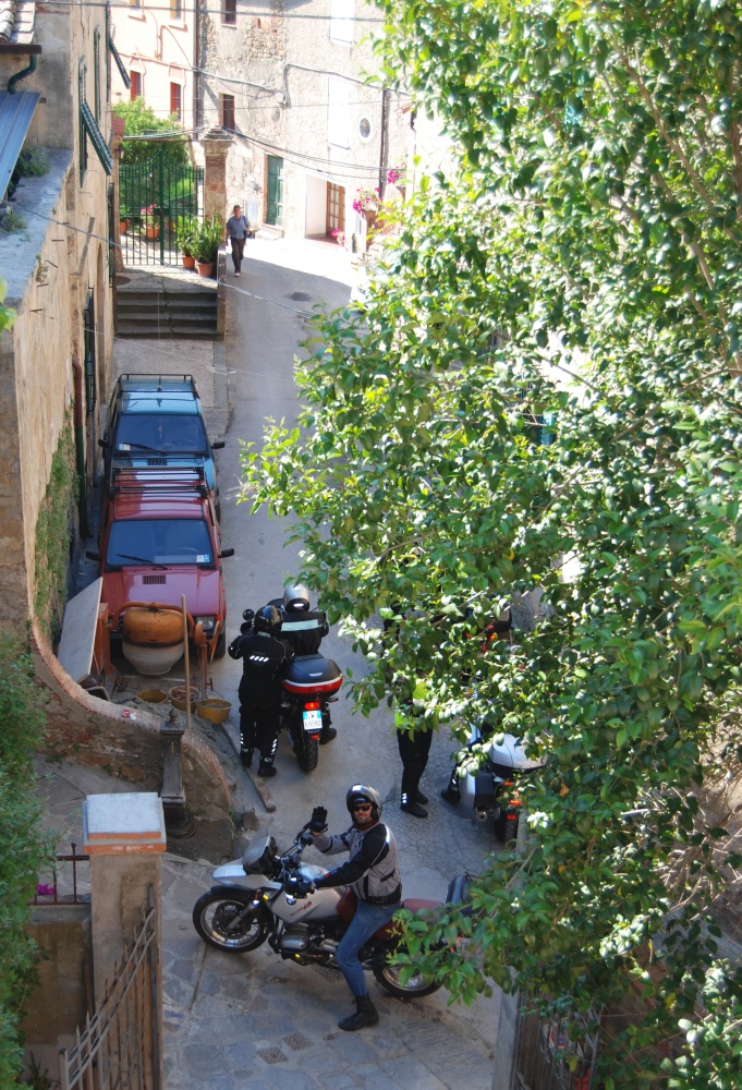 I morges dro de, fire store motorsykler med seks forventningsfulle nordmenn, på dagstur opp i Appenninnene, til marmorfjellene, til stor lunsj på vårt sære spisested i Garfagnana, til cioccolatteria’en og til hårnålssvingene i Pellegrino di Alpe. Og jeg med mitt nyopererte kne, kunne bare stå i baderomsvinduet og føle misunnelsen. Jeg tok et par bilder, og der vinker han jamen, Tage! Sukk!