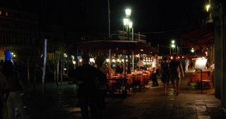 Dette er ett av Venezias to millioner spisesteder beregnet på turister. Meny på Engelsk og tysk (ikke italiensk!), massevis av kelnere, på bredden av en kanal med utsikt til palasser fra Rennessansen, dunkel og romantisk belysning. Og priser som står i stil: Her bruker du fort et par hundre euro. På en måte er det helt greit: Du vet i det minste hva du får.