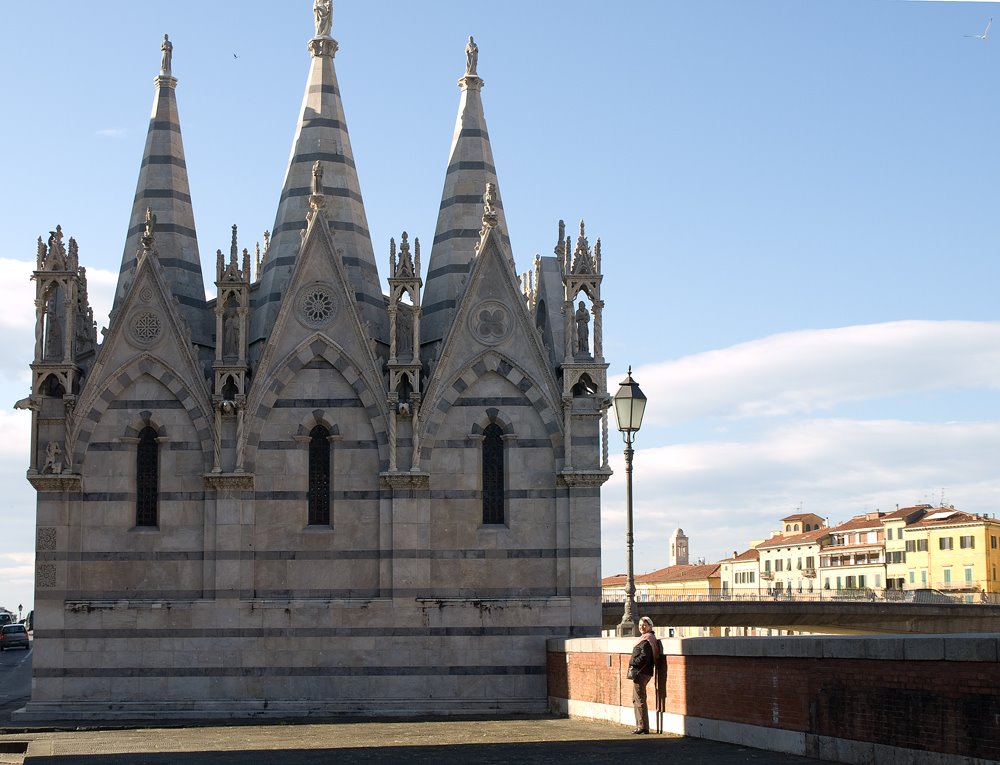 Denne lille kirka, Santa Maria della Spina, ligger som et lite smykke ved bredden av Arno. De fleste turister som vandrer i Pisa, kommer ikke hit, og det er synd. For denne unike lille bygningen er vel verdt å stoppe ved. Da den ble innviet i det 13.århundre, lå den enda lenger nede ved elva. En flom holdt på å ødelegge den, men heldigvis, den ble flyttet noen meter lenger opp. Så i dag, 700 år senere, kan vi fortsatt glede oss over denne perlen av en bygning i marmor. Flere kjente kunstnere har dekorert den med spir og statuer, blant annet Giovanni Pisano som også laget prekestolen i katedralen på Mirakelplassen. Edel og jeg tok oss en liten avstikker bortover langs elva for å nyte synet på handleturen vår i dag.